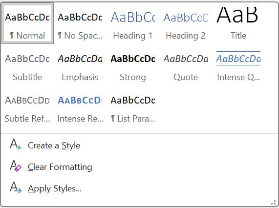 To access the Styles pane, select the expansion arrow (Alt, H, F, Y) and the Styles pane will open. Select Title. The text will be formatted to the Title style and highlighted in the Styles pane.